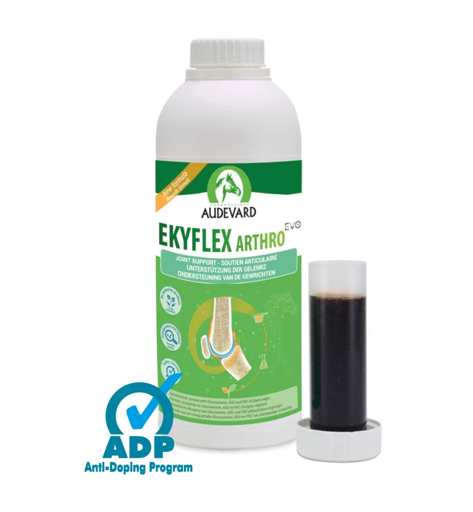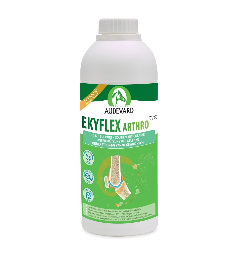 Audevard Ekyflex Arthro EVO Solution is een dopingvrij aanvullend diervoeder voor paarden dat drievoudige bescherming biedt aan de gewrichten. De geconcentreerde en complementaire ingrediënten bieden een uitgebreide ondersteuning aan zowel het kraakbeen, synoviaal vocht als het subchondraal bot.