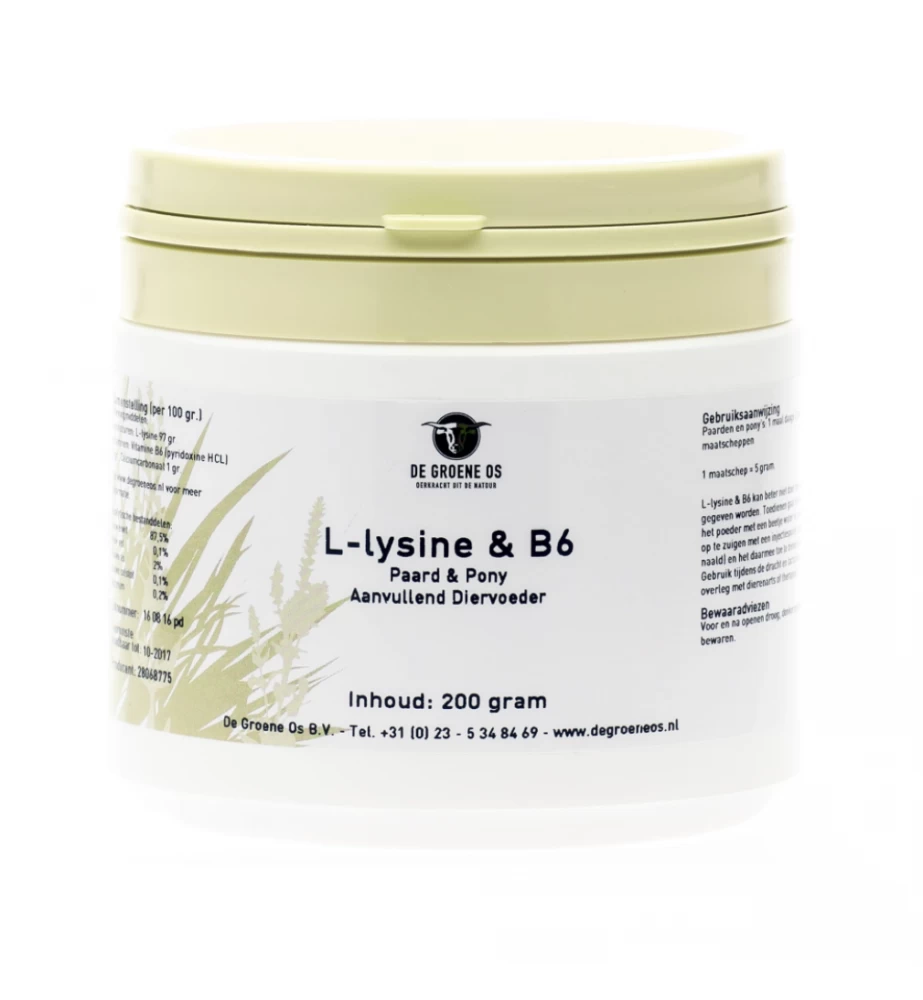 L-Lysine & B6 van De Groene Os is een 100% natuurlijke aanvullende diervoeder ter ondersteuning van de weerstand bij paarden en pony’s. Het middel bevat een combinatie van L-Lysine en Vitamine B6 die een belangrijke rol spelen in de aanmaak van afweercellen in het lichaam. Vitamine B6 zorgt er ook voor dat overmatige vermoeidheid wordt tegengegaan.