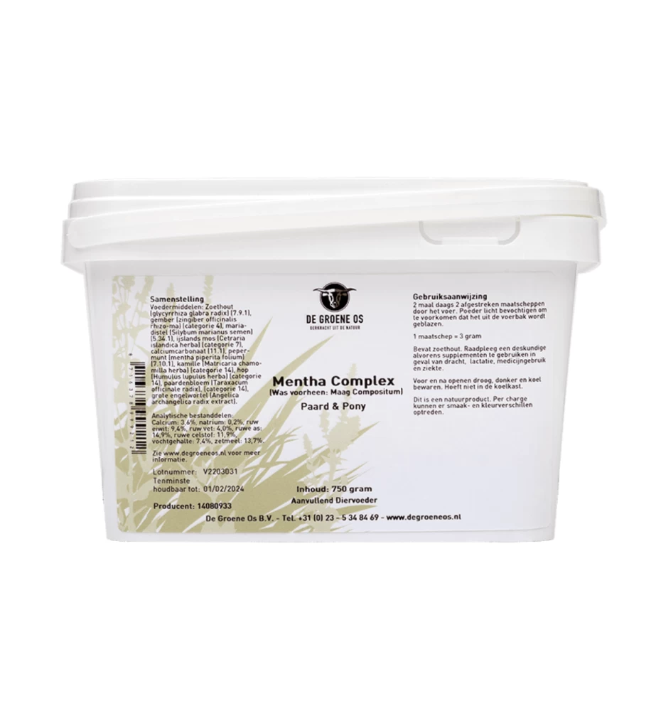 De Groene Os Mentha Complex (voorheen De Groene Os Maag Compositum) is een 100% natuurlijke aanvullend diervoeder ter ondersteuning van de maag, lever en de spijsvertering bij het paard en de pony. Het middel werkt verzachtend op de slijmvliezen, versterkt de maagwand en helpt om de normale zuurgraad van de maag in stand te houden.