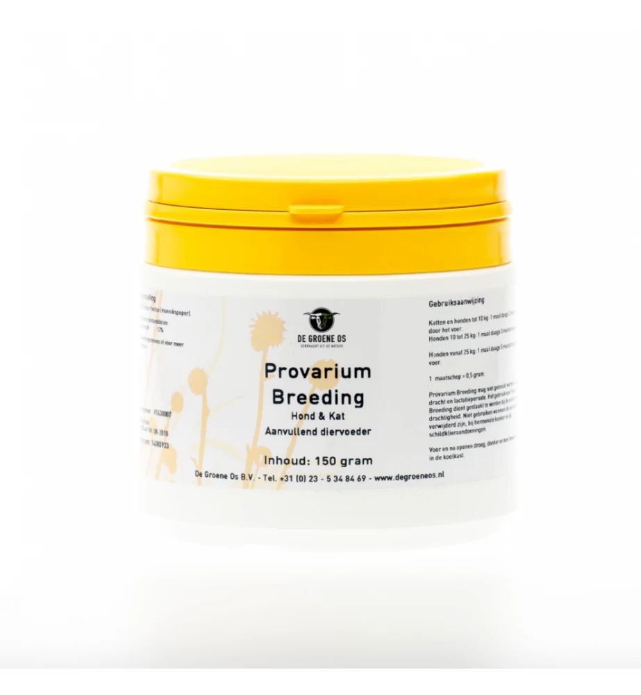 De Groene Os Provarium Breeding is een aanvullend diervoeder ter ondersteuning van het in balans houden van de hormoonhuishouding en cyclus bij teven en poezen. Daarnaast kan het ook ingezet worden bij reuen en katers die te maken hebben met een overmatige geslachtsdrift.