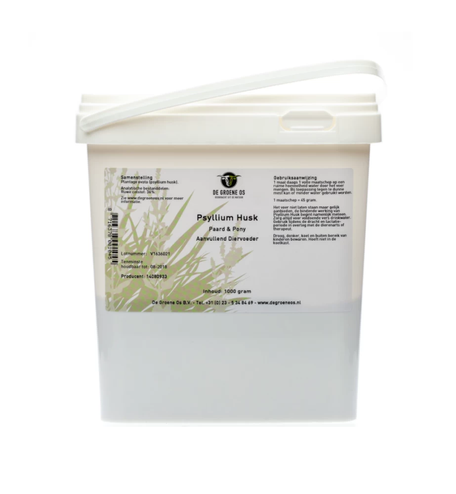 Psyllium Husk van De Groene Os is een 100% natuurlijk aanvullend diervoeder voor paarden en pony’s ter ondersteuning en vergemakkelijking van de darmpassage. De Psyllium Husk vezels hebben als eigenschap dat ze wel tot twintig maal hun eigen gewicht aan water kunnen opnemen. Hierdoor wordt de darminhoud zachter en volumineuzer en verloopt de darmpassage gemakkelijker. Psyllium Husk kan echter ook bij te dunne ontlasting worden ingezet, omdat psyllium helpt deze dikker te maken. Daarnaast heeft het middel een milde darmreinigende werking en bevordert het de spijsvertering.