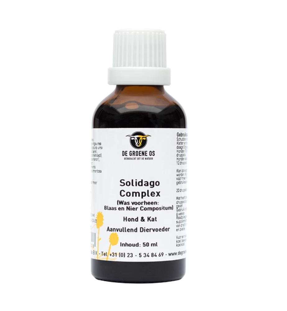 De Groene Os Solidago Complex (voorheen De Groene Os Blaas & Nier Compositum) is een 100% natuurlijk aanvullend diervoeder voor honden, katten en konijnen ter ondersteuning van de nieren en urinewegen. Het middel zorgt voor een beter filterwerking van de nieren en het schoon houden van de blaas en urinewegen. Daarnaast verhoogt het de weerstand in de blaas en bevordert het een goede vochthuishouding.