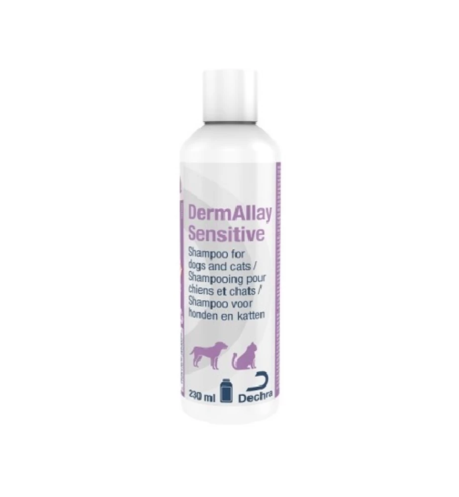 De DermAllay Sensitive is een shampoo voor honden en katten met een gevoelige huid. De shampoo is op basis van kokosnootolie dat hydraterende eigenschappen bevat. Deze shampoo mag ook gebruikt worden bij puppy’s en kittens.