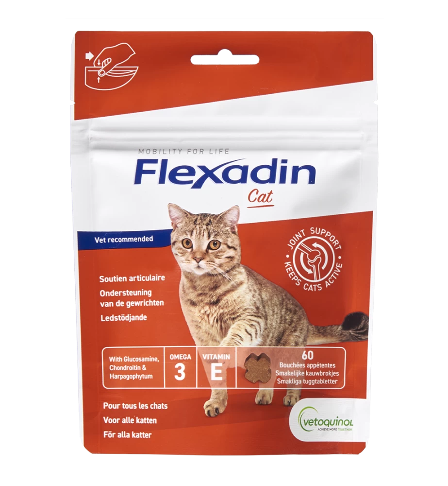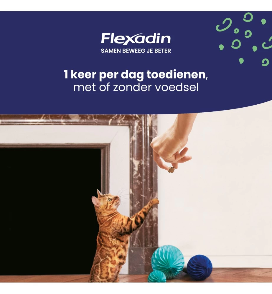 Bovendien is Flexadin ook zeer makkelijk te geven. De smakelijke, zachte kauwbrokjes kunnen als traktatie worden gegeven of onder het voer worden vermengd. Afhankelijk van het gewicht van je kat zijn 1 of 2 smakelijke kauwbrokjes per dag reeds voldoende.