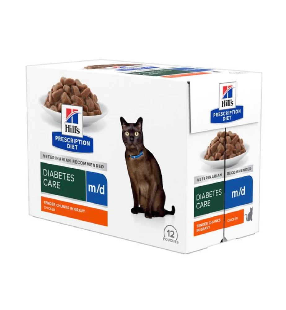 Hill’s Prescription Diet M/D/ Diabetes Care is een complete natvoeding die een speciale samenstelling heeft om katten te helpen om gewicht te verliezen en om het bloedglucose te helpen stabiliseren ter ondersteuning bij katten die te kampen met Diabetes Mellitus. Dit natvoer voor katten is gemaakt met kip en heeft een heerlijke smaak waar je kat dol op zal zijn.