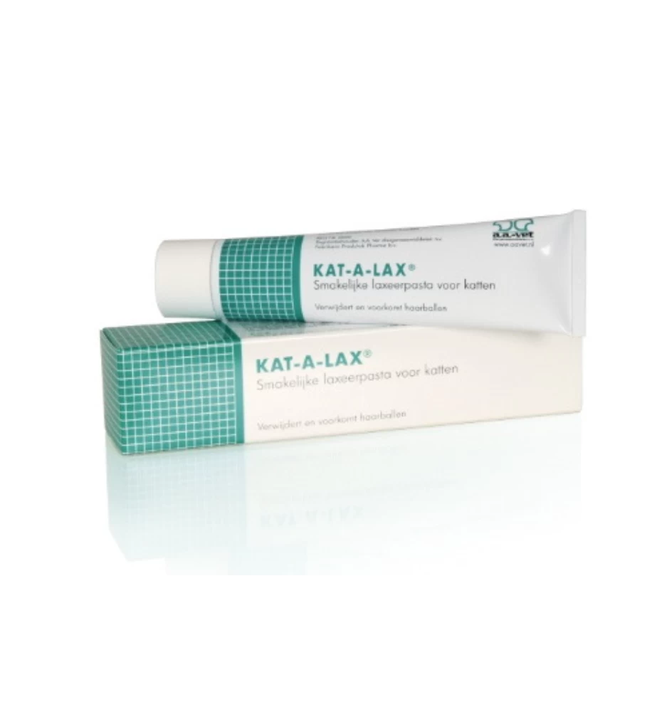 Kat-A-Lax is een zeer smakelijke laxeer- & haarbalpasta op basis van witte vaseline. Deze zorgt ervoor dat er zich een water-onoplosbare laag om de haarballen vormt, waardoor deze makkelijk uitgebraakt kunnen worden. De Kat-A-Lax bevat daarnaast moutsiroop, wat ervoor zorgt dat er een osmotisch effect ontstaat, waardoor de haarballen in het maagdarmkanaal wat meer volume krijgen en zo makkelijker zijn uit te braken of in de ontlasting kunnen komen.