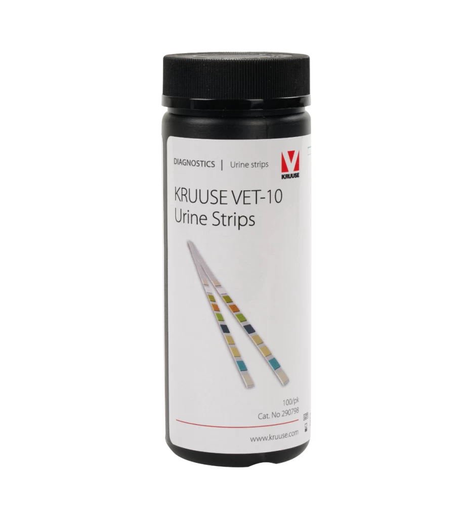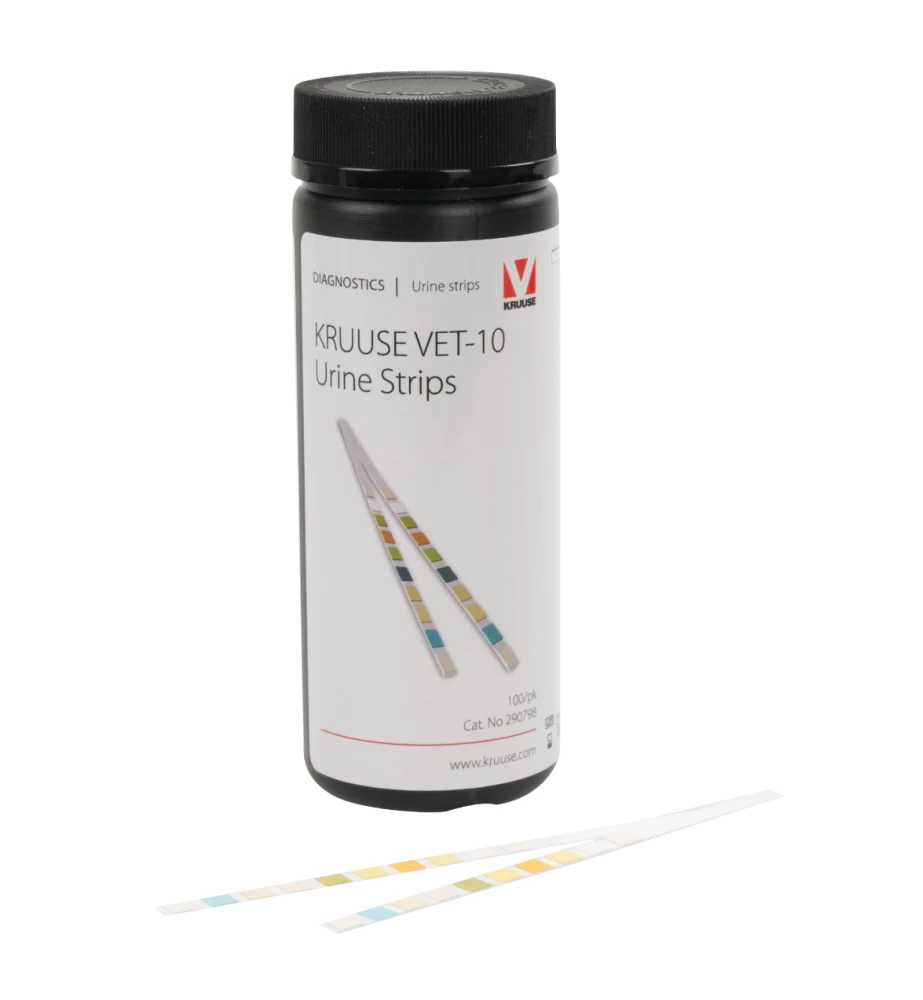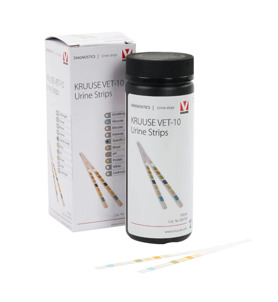 De Kruuse VET-10 Urine Test Strip is een gemakkelijk en voordelige test voor het analyseren van urinemonsters bij dieren. De test bevat een duidelijke indicatorvelden die qua kleur vergeleken kunnen worden met de meegeleverde kleurenkaart. Het resultaat verschijnt binnen 60 seconden.