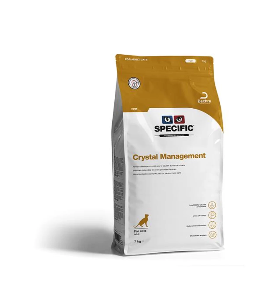 Specific Crystal Management FCD is een dieetvoeding voor katten die preventief tegen de vorming van struviet- en calciumoxalaat gruis werkt. Deze voeding beschikt over een verlaagd natriumgehalte waardoor het mogelijk is deze langdurig te gebruiken. In het Specific Crystal Management FCD dieet zitten minder mineralen (magnesium & fosfor) wat ervoor zorgt dat zich geen nieuwe kristallen vormen. Daarnaast is de voeding rijk aan Omega-3 vetzuren uit vis (EPA & DHA) wat zorgt voor een gezonde vacht, huid en soepele gewrichten.
