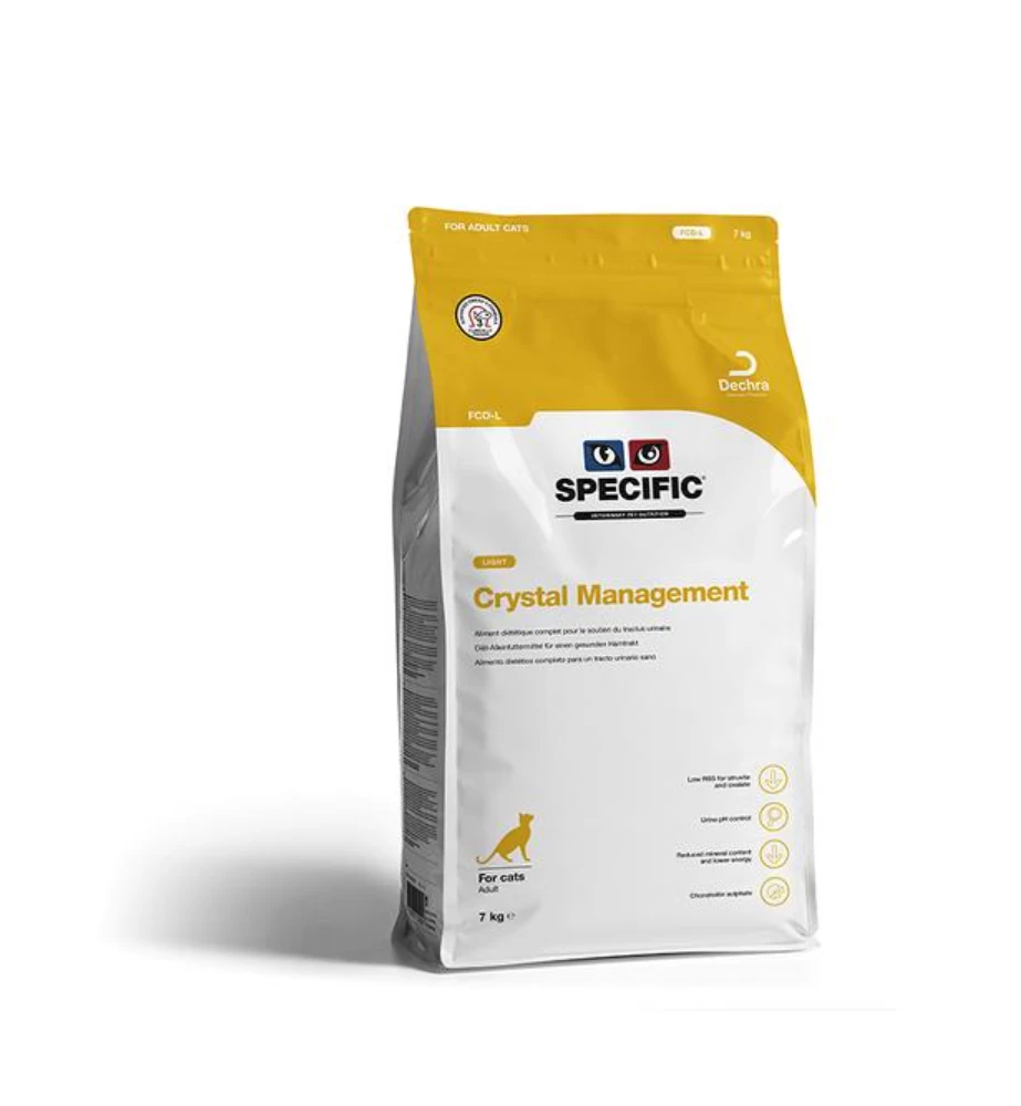 Specific Crystal Management Light FCD-L is een dieetvoeding voor katten de preventief werkt tegen de vorming van struviet- en calciumoxalaat gruis. Vanwege de lage energiewaarde is deze voeding ideaal voor katten die problemen hebben met overgewicht. Door het lage gehalte aan natrium is deze voeding geschikt om langdurig te geven.  In het Specific Crystal Management Light FCD-L dieet zitten minder mineralen (magnesium & fosfor) wat ervoor zorgt dat zich geen nieuwe kristallen vormen. Daarnaast is de voeding rijk aan Omega-3 vetzuren uit vis (EPA & DHA) wat zorgt voor een gezonde vacht, huid en soepele gewrichten.