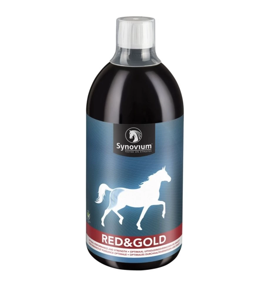 Synovium Red & Gold is een voedingssupplement voor paarden (en veulens) dat rijk is aan vitaminen, mineralen en ijzer ter ondersteuning van de spieren, organen en weefsels. Synovium Red & Gold zorgt voor een verhoging van de algemene weerstand en energie bij verhoogde inspanning.